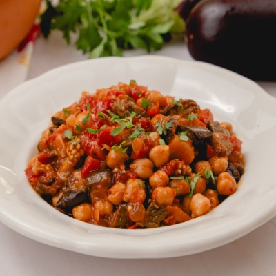 This is a delicious Middle Eastern moussaka recipe made with eggplant, chopped tomatoes, chickpeas, onion and garlic that makes for a perfect vegetarian lunch or dinner.
